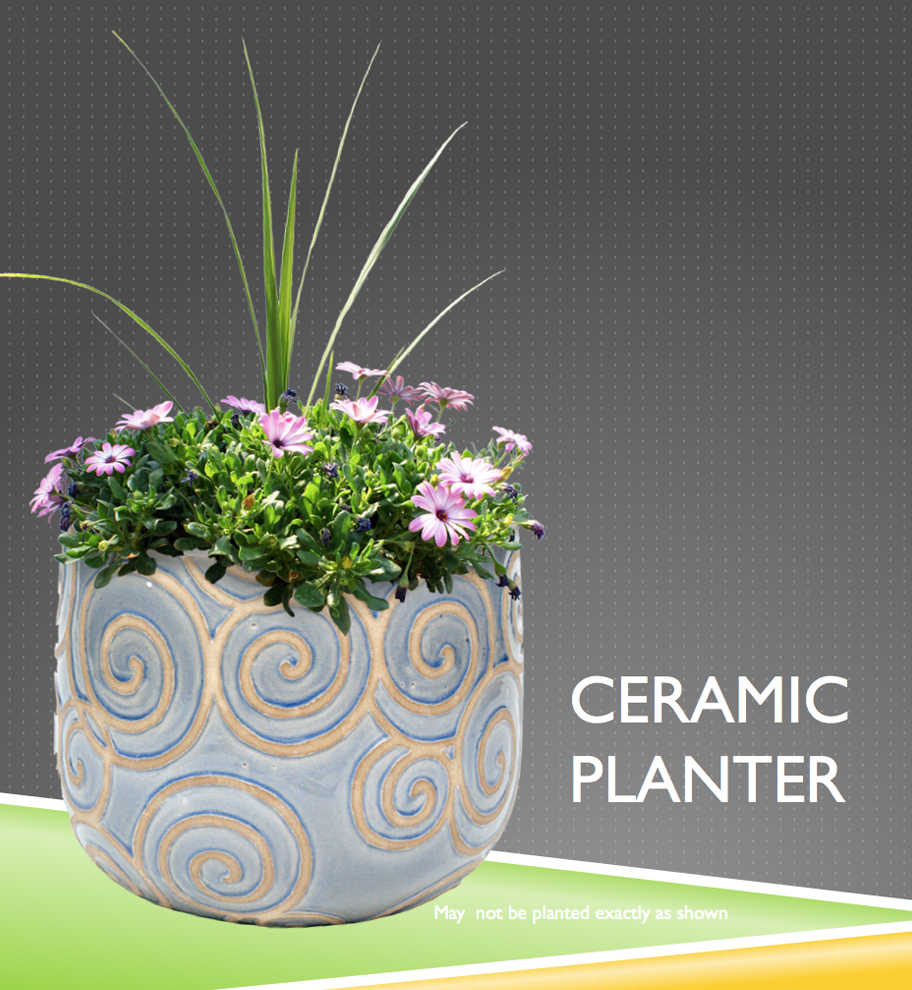 This extra large container features beautiful hand applied sand finish accented by sun loving bulb and annuals. A striking contrast to any restaurant pation, hotel entry or even just at home in your backyard. Available in 3 colours: