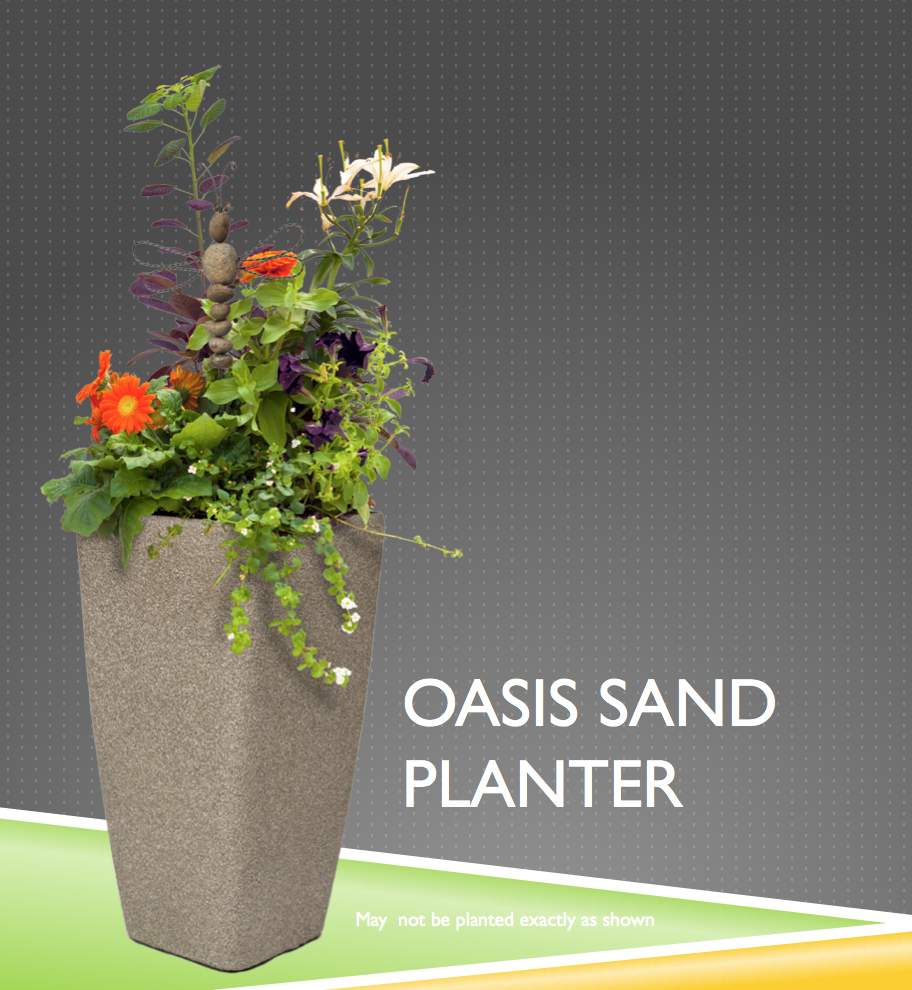 This extra large container features beautiful hand applied sand finish accented by sun loving bulb and annuals. A striking contrast to any restaurant pation, hotel entry or even just at home in your backyard. Available in 3 colours: